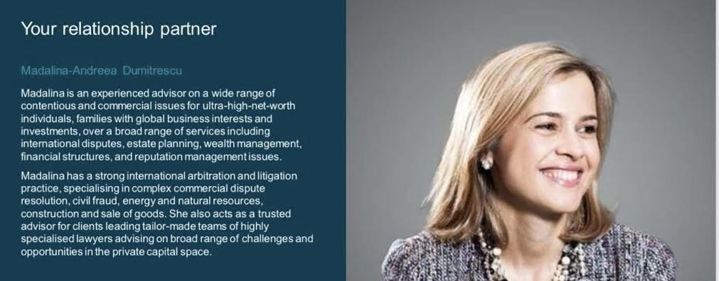 - She represented the Romanian Government, the office of the Prime Minister, internationally in relation to all its international litigation and arbitration matters for 10 years